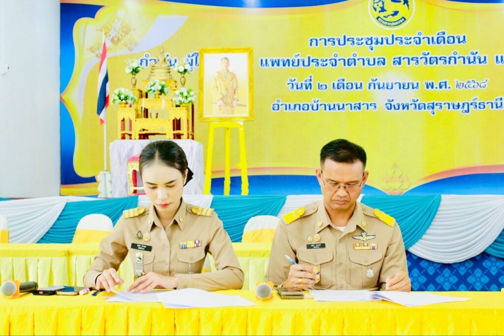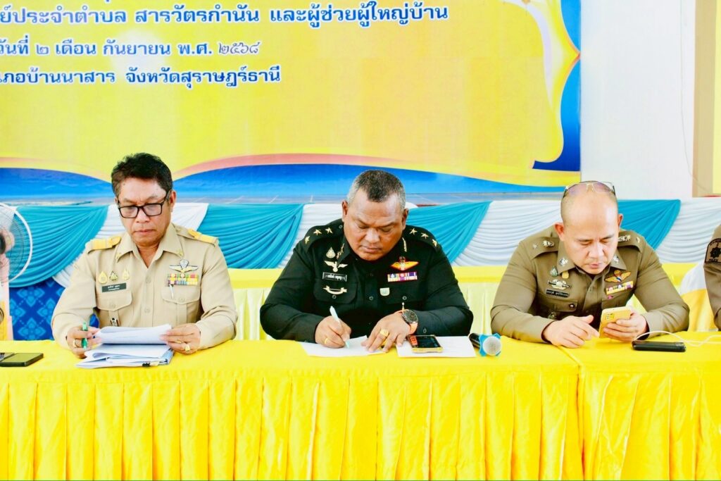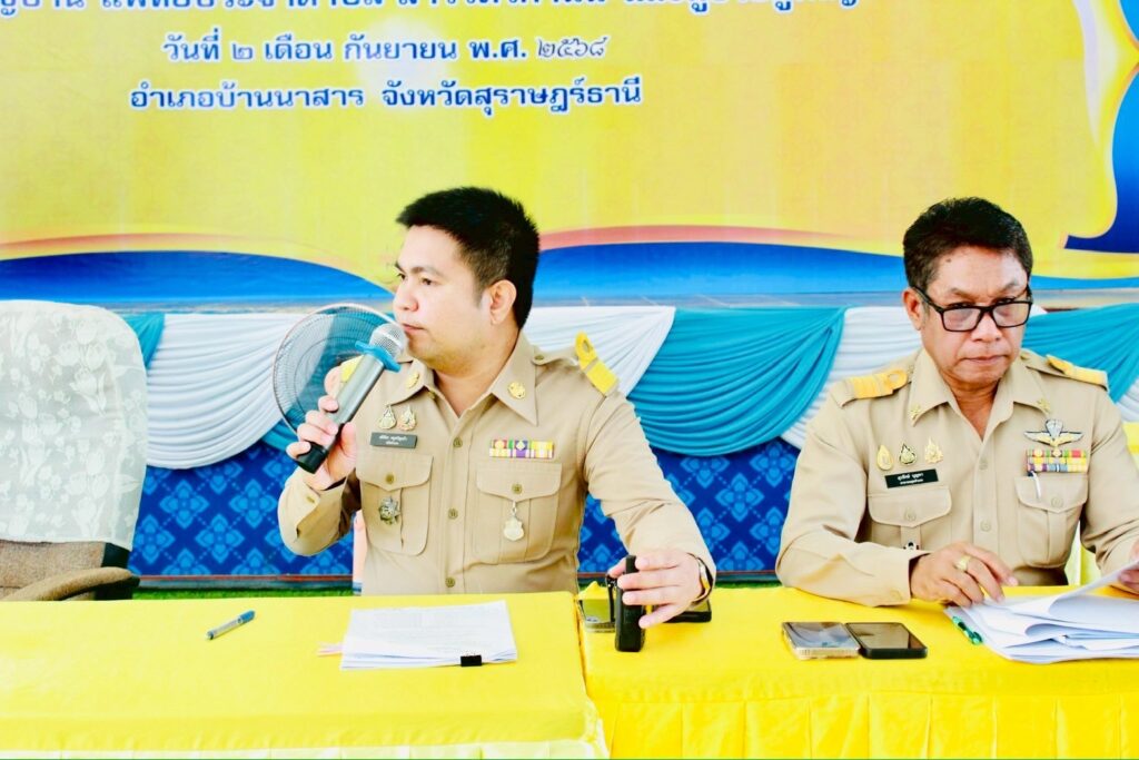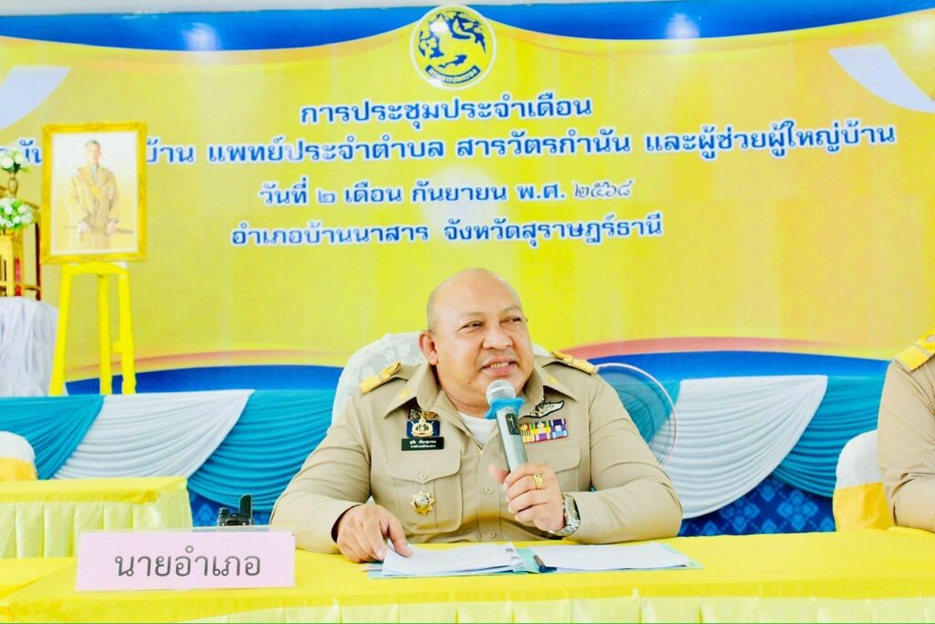 วันที่ 2 กันยายน 2568 เวลา 08.30 – 12.00 น. นายอุทัย เทือกสุบรรณ นายอำเภอบ้านนาสาร เป็นประธานการประชุมกำนัน ผู้ใหญ่บ้าน ฯลฯ ประจำเดือนกันยายน 2568 โดยมีหัวหน้าส่วนราชการประจำอำเภอ หัวหน้าหน่วยงานรัฐวิสาหกิจ ปลัดอำเภอ และผู้บริหารองค์กรปกครองส่วนท้องถิ่น เข้าร่วมประชุม ณ ศาลาประชาคมอำเภอบ้านนาสาร ซึ่งมีระเบียบวาระที่สำคัญ ดังนี้